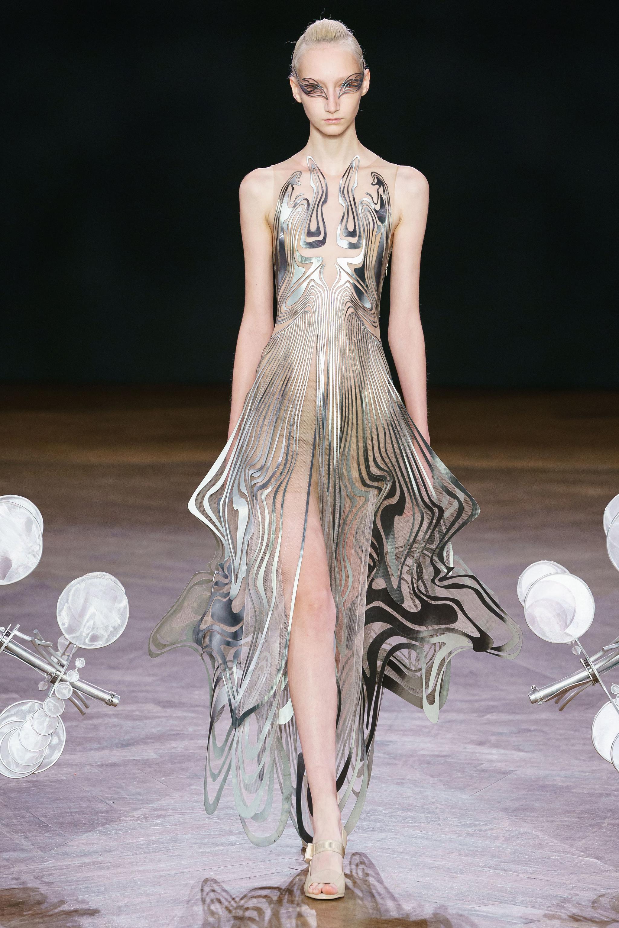 除了利用了3D打印技術,本次秀中,和Anthony Howe合作創作的球形“Omniverse”雕塑裝置的旋轉運動,以及帶有“羽毛翅膀”的無限環繞旋轉連衣裙,都可以達到催眠效果,本次時尚和科技的結合讓大家大開眼界。